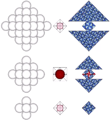 Spheres close pack as tetrahedra in even-numbered layers around octahedra (spaces) and VEs (spheres). In odd-numbered layers, the spheres surround a positive or negative tetrahedron (concave octahedron interstice). The growth pattern repeats every fourth layer, with the first layer surrounding a positive tetrahedron (concave octahedron interstice); the second layer surrounding an octahedron (concave VE space); the third layer surrounding a negative tetrahedron (concave octahedron interstice); and the fourth layer surrounding a VE (sphere).