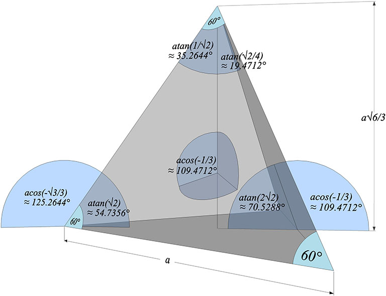 - Dihedral angle: atan(2√2) ≈ 70.5288°