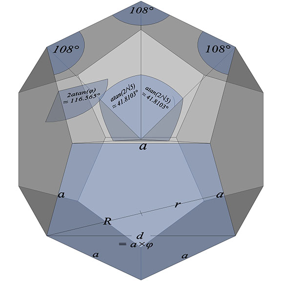 The pentagonal, or “regular,” dodecahedron with edge length, a, has the following dimensions when expressed in terms of the golden ratio (φ):