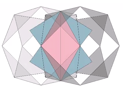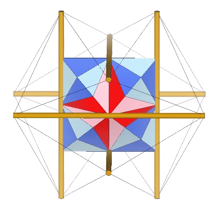Note that the coupler is polarized and seems to point, forwards and backwards, along the vector of its displacement between the VE and octahedron, i.e. from the sphere in the direction of its adjoining space (or vice versa). The only other polyhedron whose quanta module construction is similarly polarized is the cube. The orientation of the cube in the quanta module construction of the isotropic vector matrix determines the polarity of the tetrahedron, and the six-strut tensegrity that defines the Jessen is the spherical phase of the tensegrity tetrahedron, the wave function, if you will, that collapses into either a positive or negative tetrahedron. (See also: Dual Nature of the Tetrahedron.)