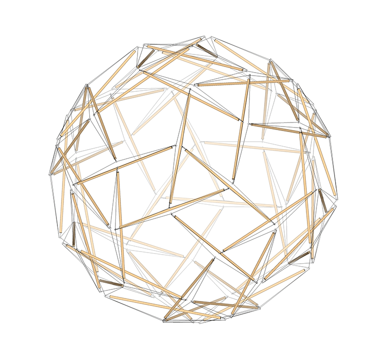 From its spherical phase, the 60-strut tensegrity sphere is reduced to the tensegrity icosidodecahedron by moving each strut along the long tendon toward the end of its dangler, as illustrated below.