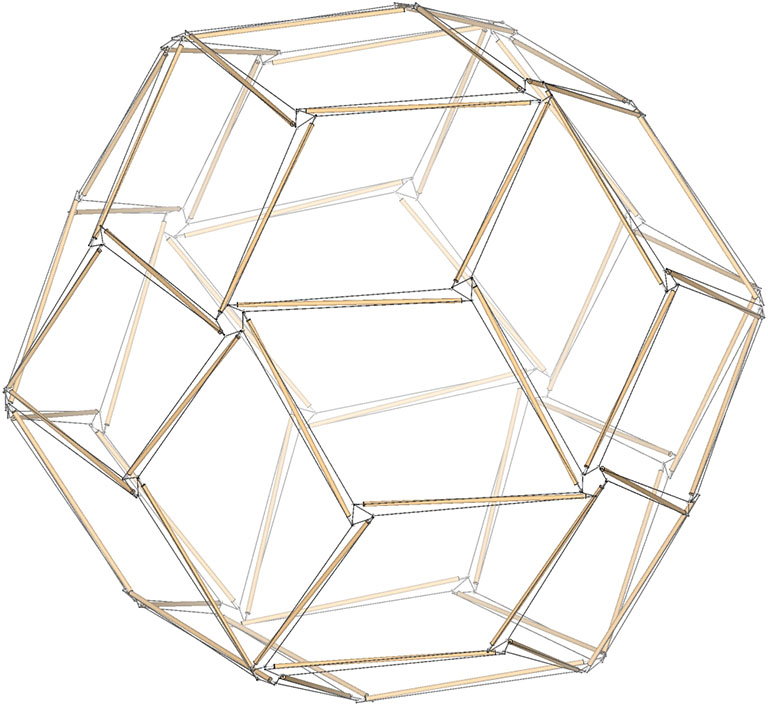 From the spherical phase, the 60-strut tensegrity sphere is reduced to the tensegrity rhombic triacontahedron by moving each strut along the short tendon toward the end of its dangler, as illustrated below.